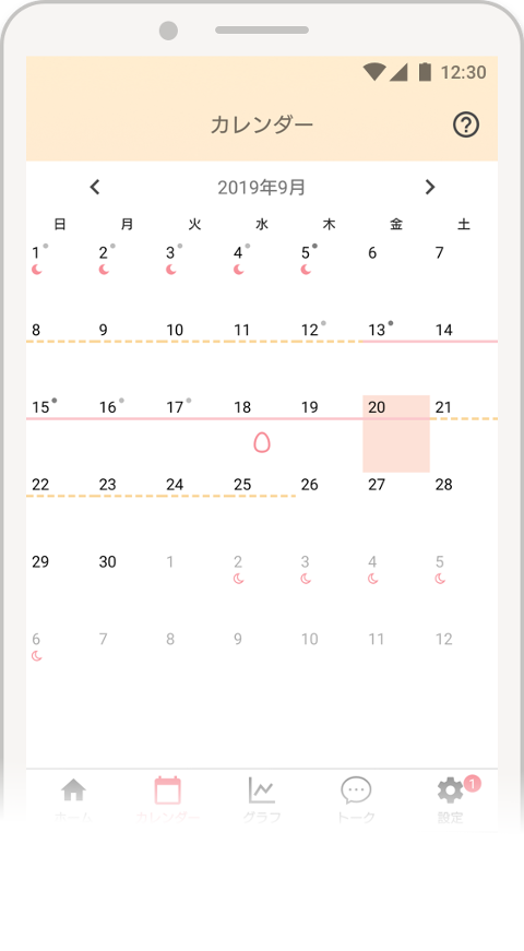 生理周期データをカレンダーで視覚化します。今までの生理記録や次の生理日・排卵日の予測、妊娠しやすい/妊娠しづらい時期がカレンダーでひと目で分かる!旅行やお出かけのスケジュールも立てやすい♪