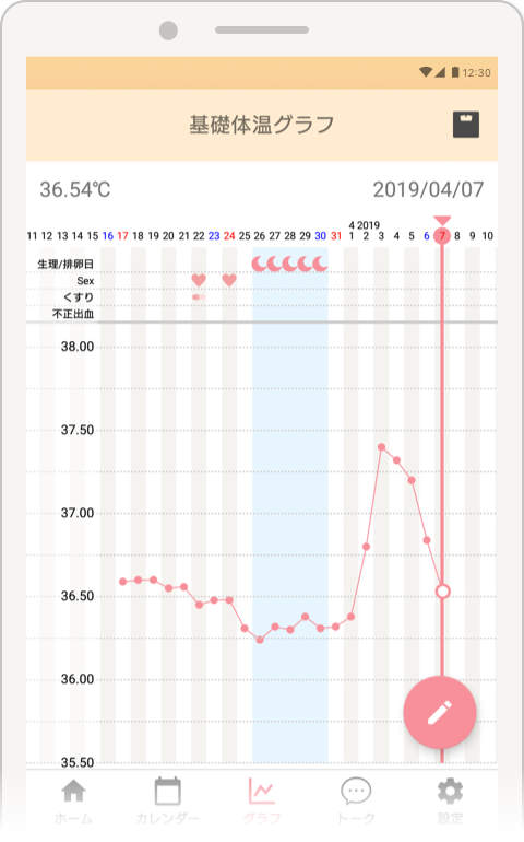 生理周期の予測や把握には、基礎体温を毎日決まった時間に計測することも大切です。基礎体温の日々の変化はグラフで確認しましょう。痩せやすい時期が分かる体重グラフに切り替えもできるので、健康管理アプリやダイエットアプリとしても活用できます♪