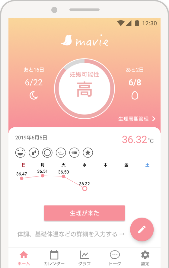 マビーがあれば次の生理日、妊娠しやすい時期、基礎体温の推移などをバッチリ把握!